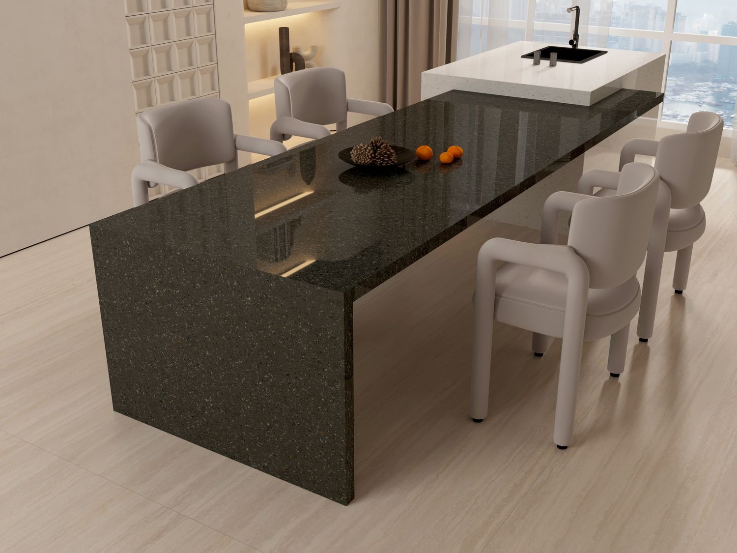 This sleek sintered ceramic slab features a dark, speckled texture, perfect for modern interiors. Its durable surface is ideal for countertops and flooring.