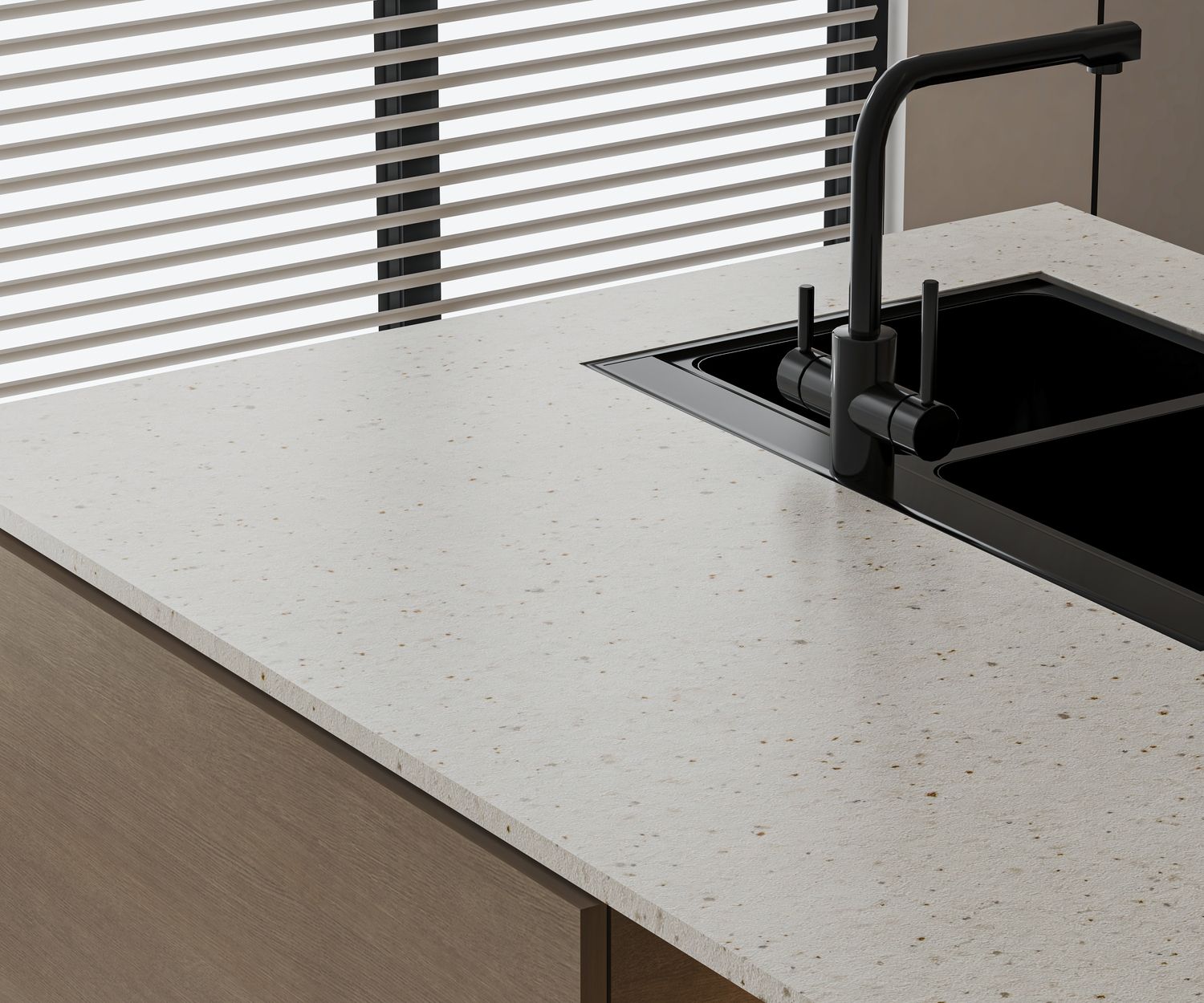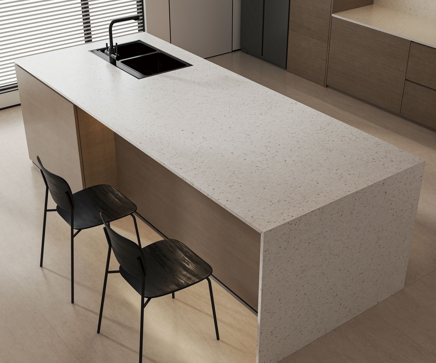 This elegant sintered ceramic slab features a subtle speckled pattern on a light background, perfect for modern minimalist designs.