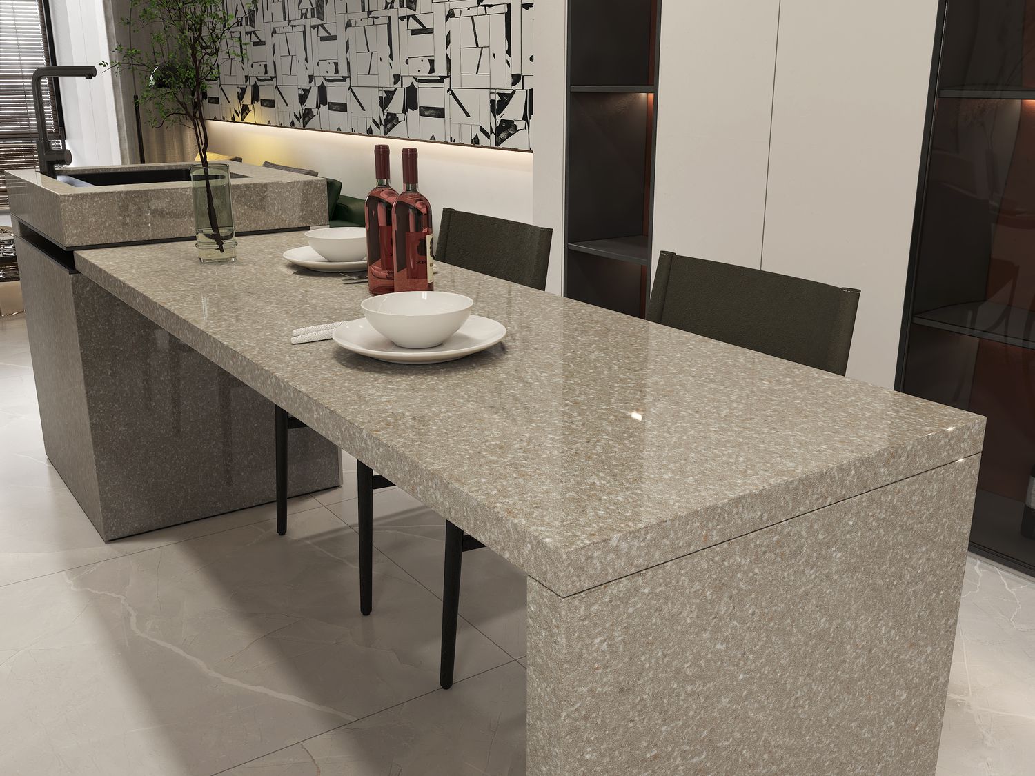 This sintered ceramic slab features a speckled texture in a neutral gray tone, ideal for modern interiors.